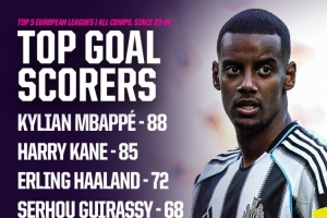 据Opta统计,2023-2024赛季以来,伊萨克各赛事打进52球,五大联赛球员第7多。