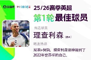 2025-2026赛季英超开赛-绿茵梦想,再度启航!体育资讯和咪咕体育联合发起每轮英超最佳球员评选活动!第一轮评选结果结出炉,首轮比赛贡献双响+精彩倒钩的理查利森获得30.66%投票吧友的支持,以微弱优势击败曼城新援赖因德斯当选 体育资讯X咪咕体育 英超首轮最佳球员!