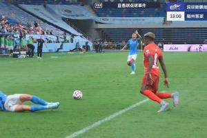 比赛第32分钟,恩戈姆禁区内犯规,经VAR检查后,主裁判罚点球,韦斯利主罚命中,新鹏城1-0领先梅州。