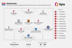 体育资讯9月5日讯 荷兰在本轮世预赛主场1-1战平波兰,荷兰队本场比赛首发有8人都来自英超。
