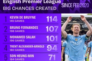 2020年2月以来英超创造重大机会榜: