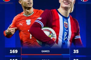 德转将哈兰德进球数据与C罗进行对比,后者国家队169场119球。