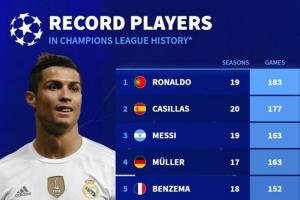 欧冠历史出场榜:C罗183场居首,梅西第三,诺伊尔有望进入前三