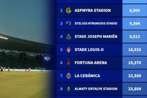 本赛季欧冠容量最小球场排名:卡拉巴赫主场5800人居首