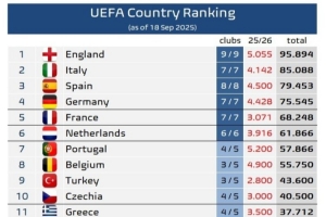 欧足联旗下各协会欧战积分排名:英超独自领跑,意甲优势略微缩小