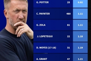 体育资讯9月21日讯 英超第5轮比赛,西汉姆联在主场以1-2的比分不敌水晶宫,格拉汉姆-波特遭遇下课危机。根据数据统计,波特是西汉姆联队史拿分率最低的主教练,场均仅能拿到0.92分。