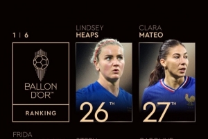 体育资讯9月22日讯 金球奖颁奖典礼,女足金球奖排名第26-30名公布。