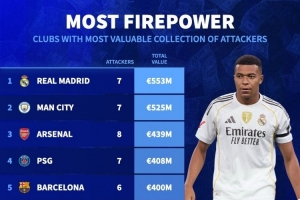 俱乐部锋线球员总价排名:皇马5.53亿欧居首,曼城、阿森纳二三位