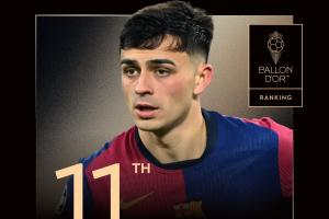 佩德里今年金球奖排名第11名,落后第十的努诺-门德斯47分。