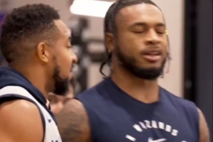 球队新援CJ-麦科勒姆戴着麦克风上阵,作为老将的他积极鼓励队友。
